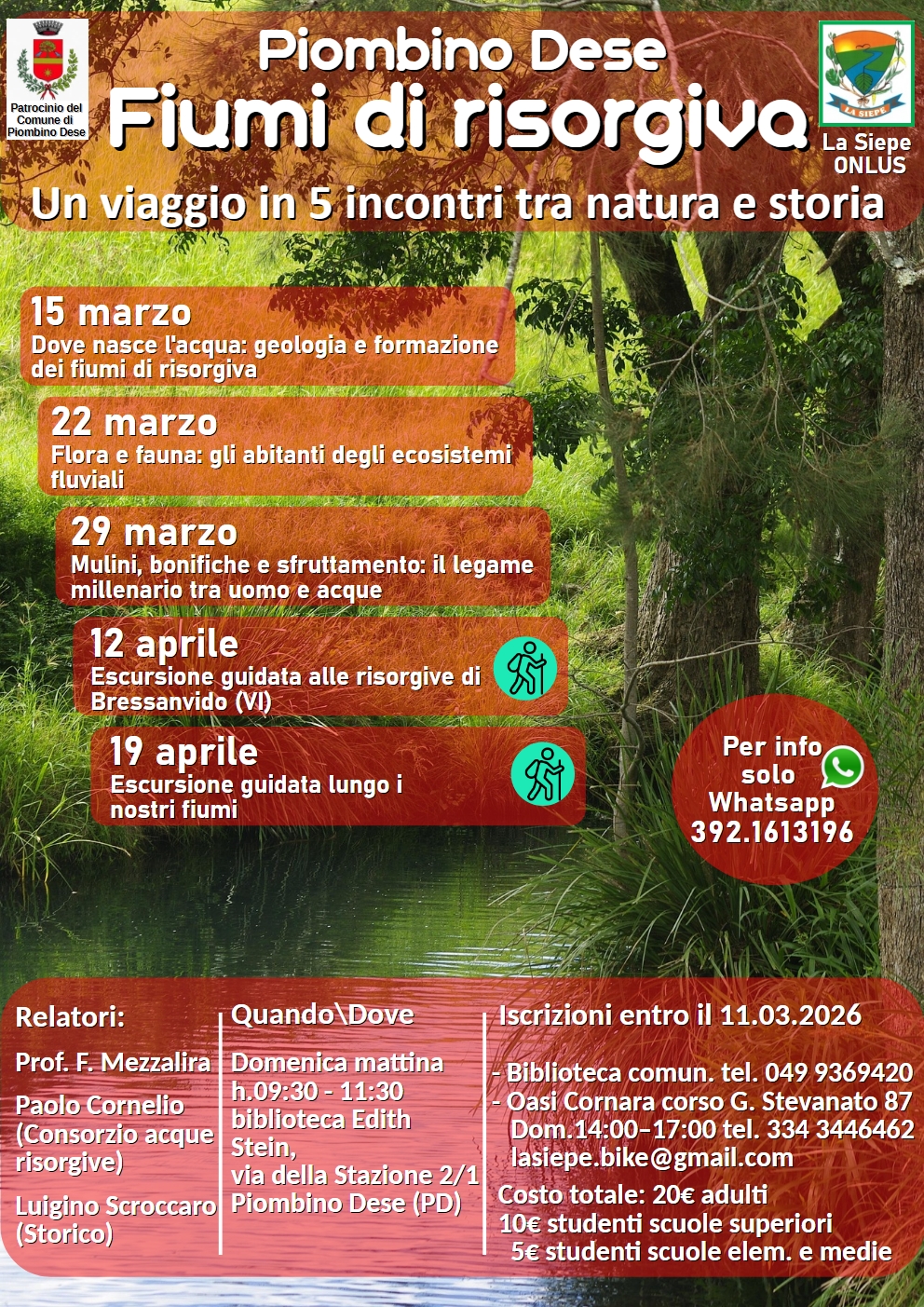 - Domenica 15 marzo: Dove nasce l'acqua, geologia e formazione dei fiumi di risorgiva